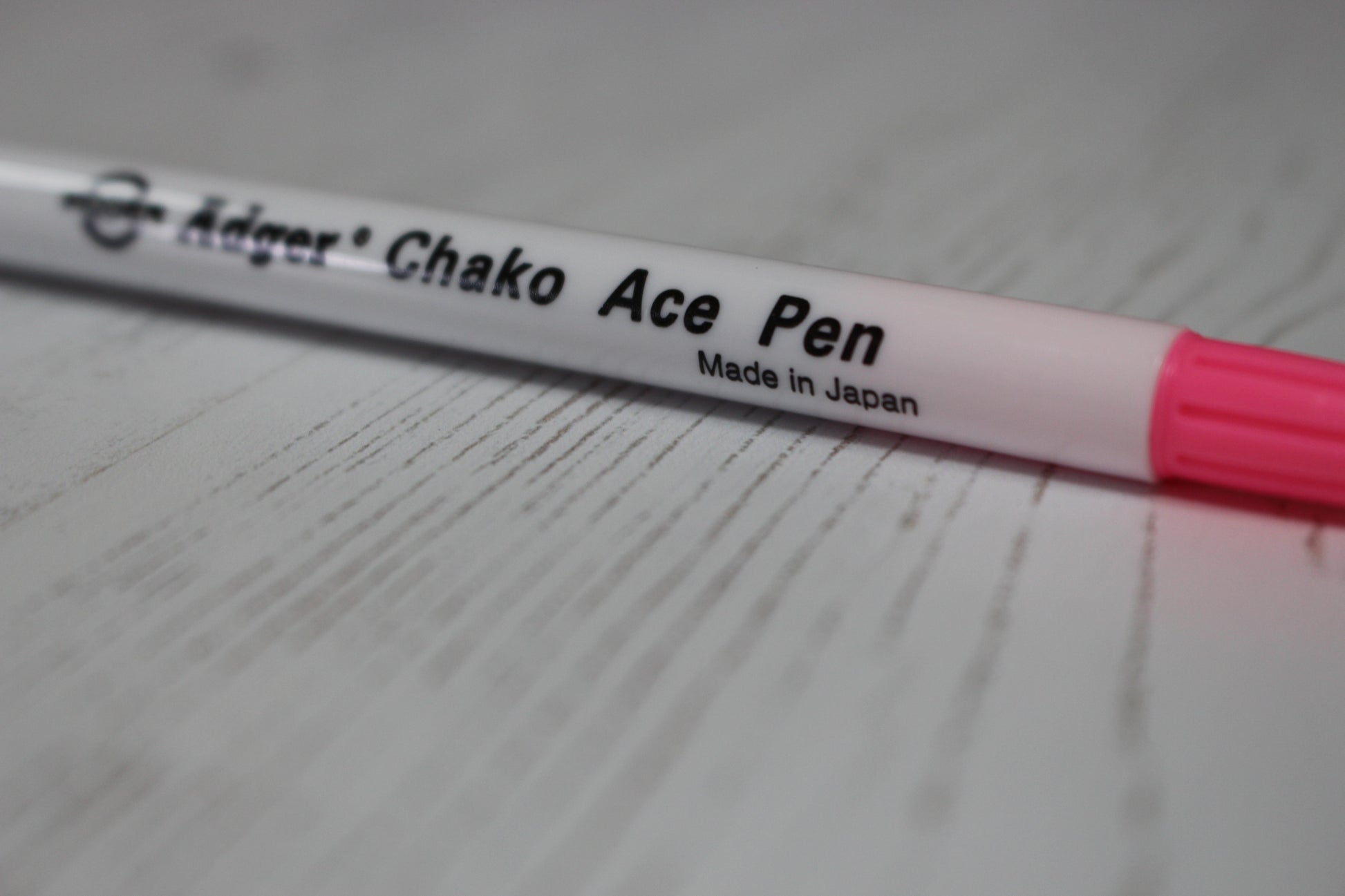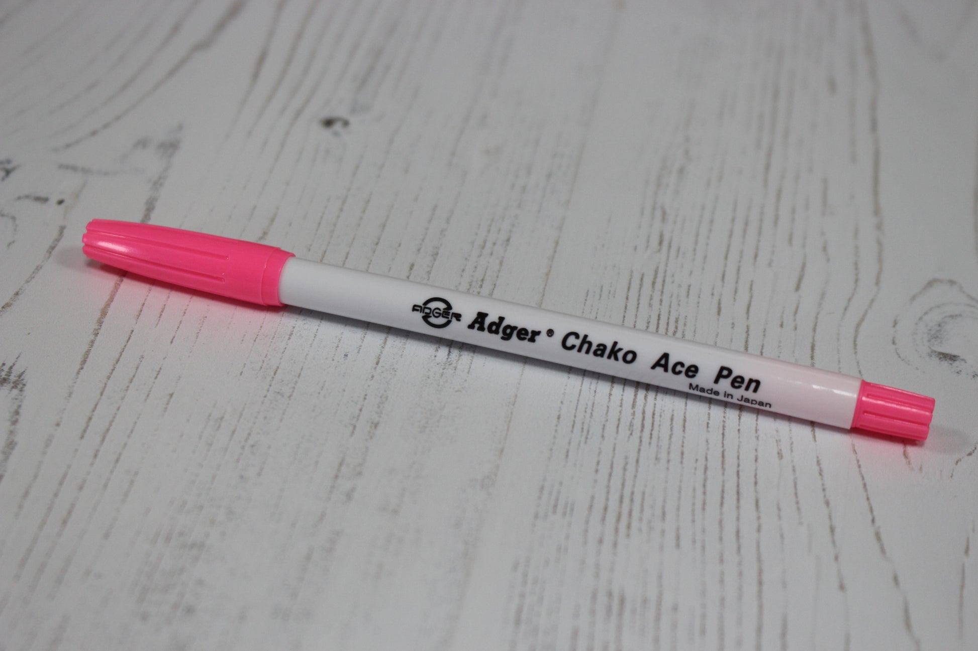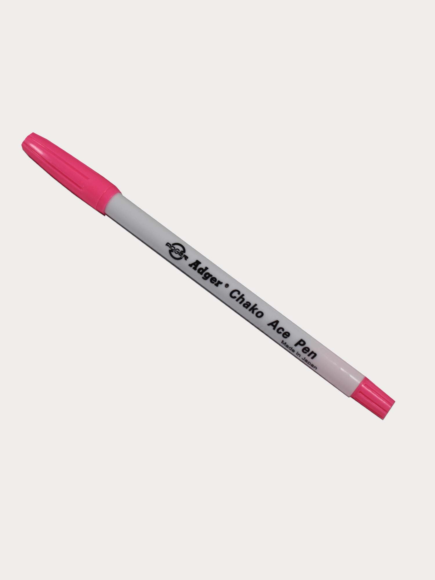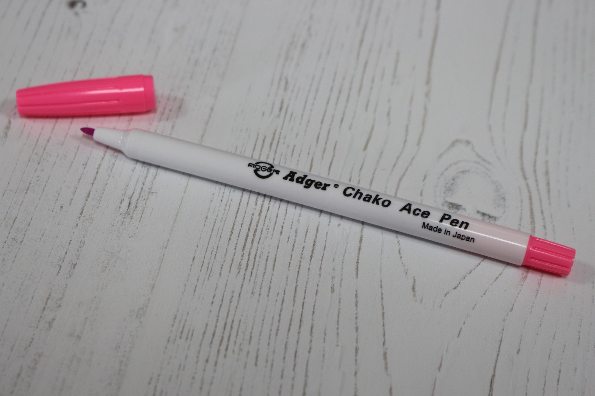 A genuine Adger Chako Ace marker pen that has vanishing pink ink. Generally used for dressmaking, handicraft, embroidery, artificial flowers, temporary line marking. A contemporary alternative to tailor's chalk.
