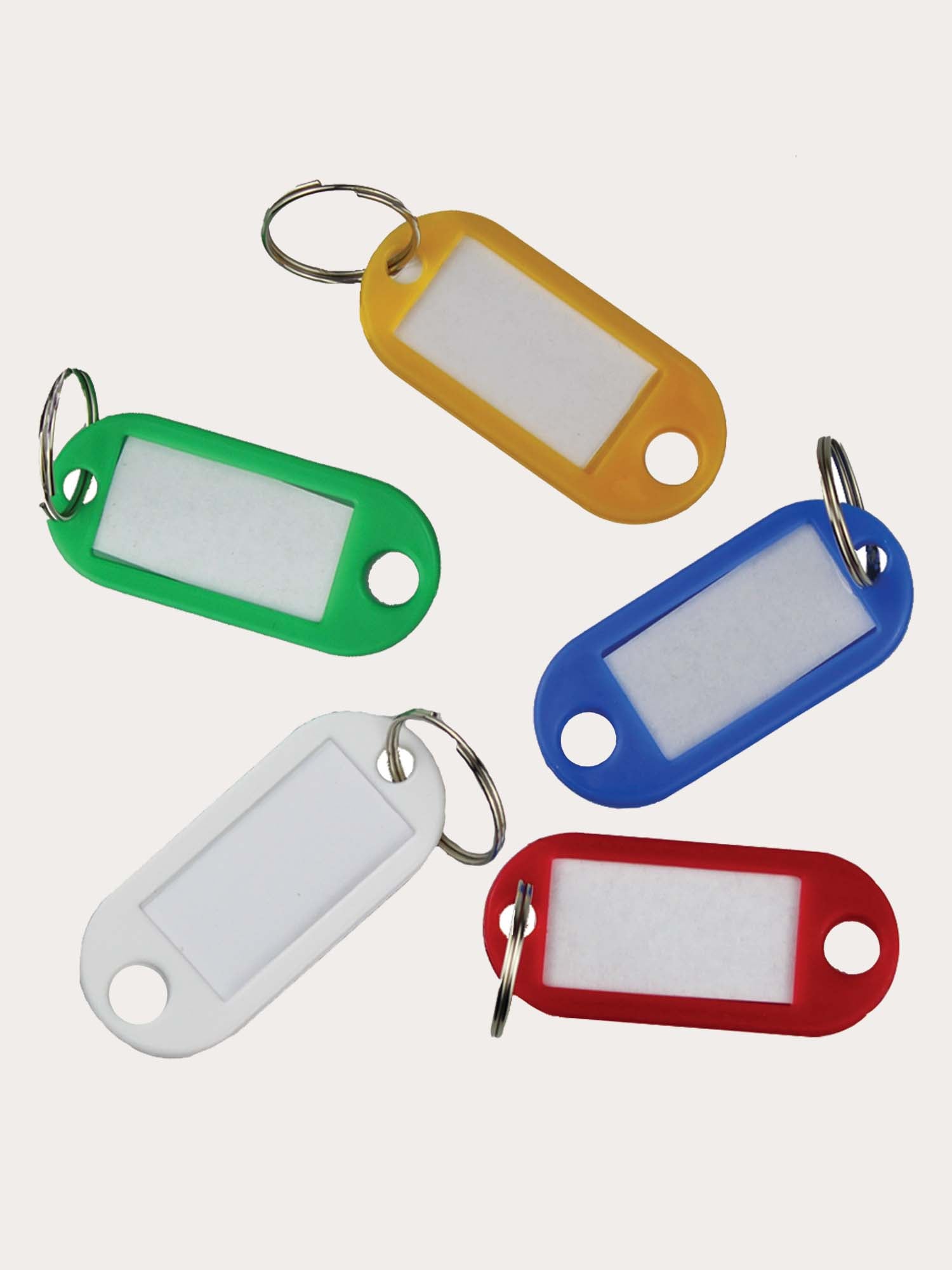 Key fobs / luggage labels and identity tags for marking up your keys and personal belongings. They have a removable piece of white card for writing your details or attaching a label which is protected by a clear plastic window which slides inside the colourful plastic outer case.