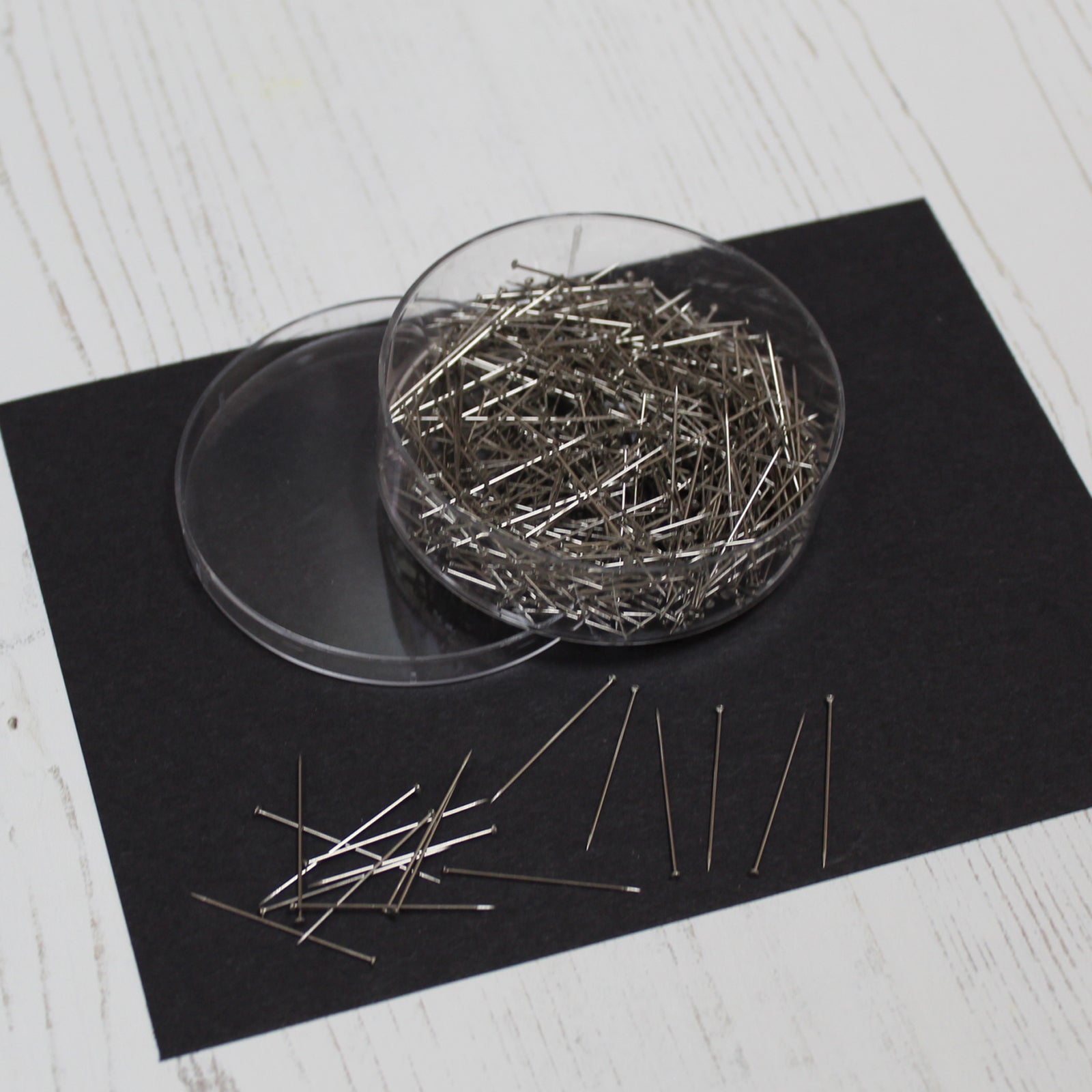 20g ~ (Approximately 400 pins) in a round plastic case with lid.