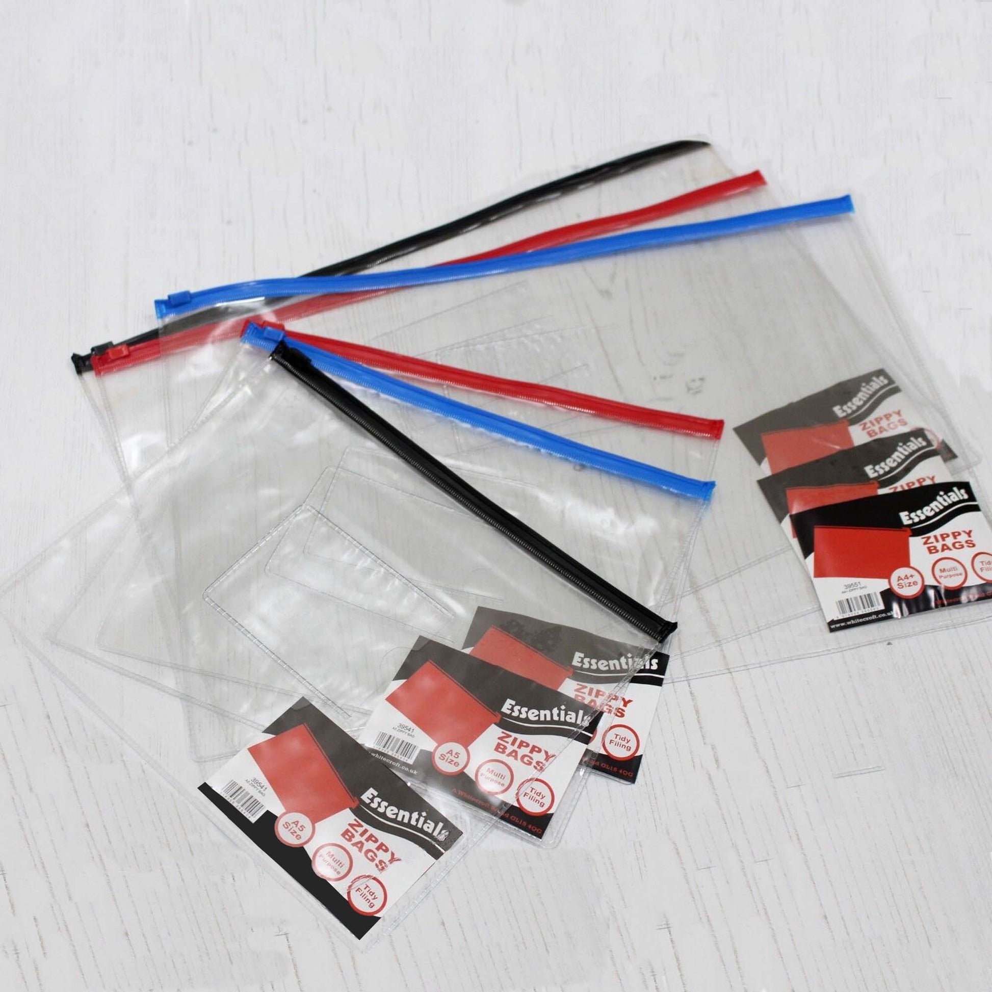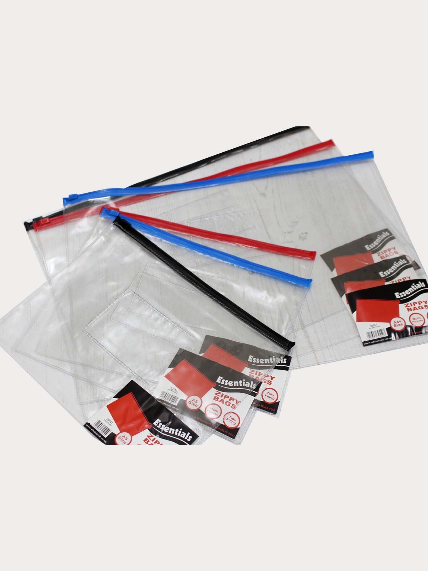 Flexible clear bags with zip top and front ID holder which are tough and durable to keep all of your documents, craft, sewing & art items neat and tidy. The label on the front is easy to peel off.