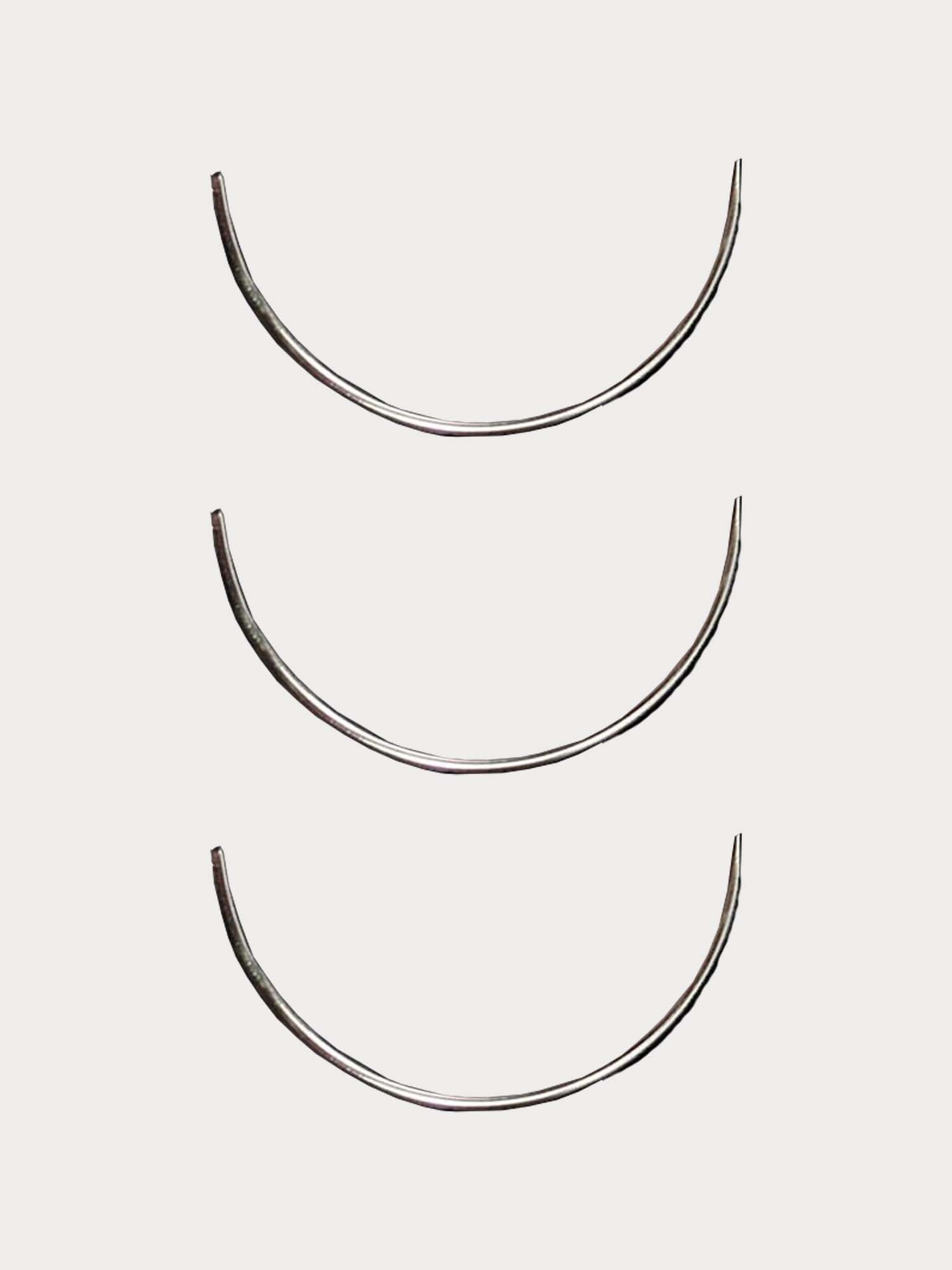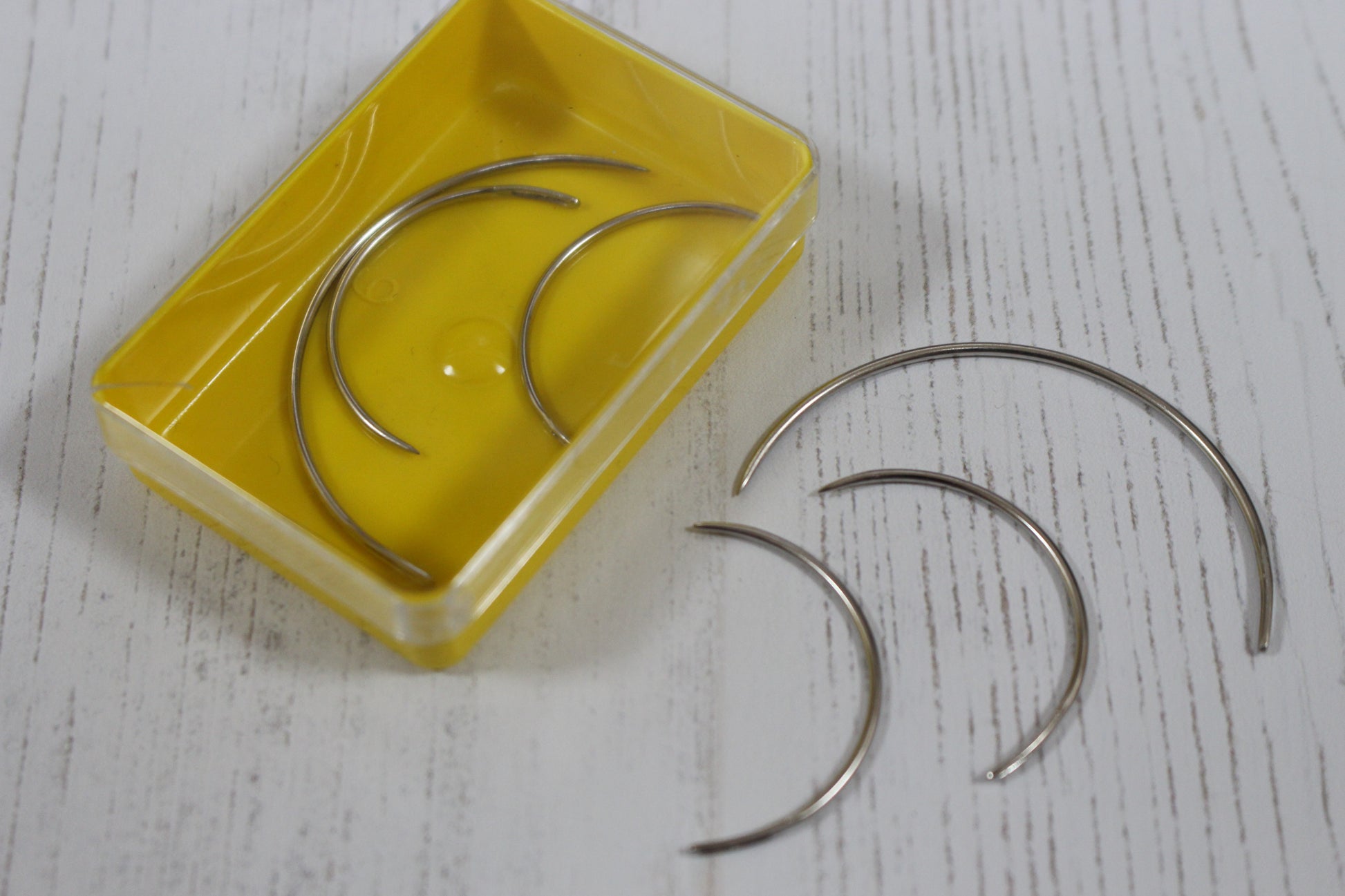 Set of three, high quality nickel plated hardened steel curved repair needles in a handy plastic storage case with clear lid