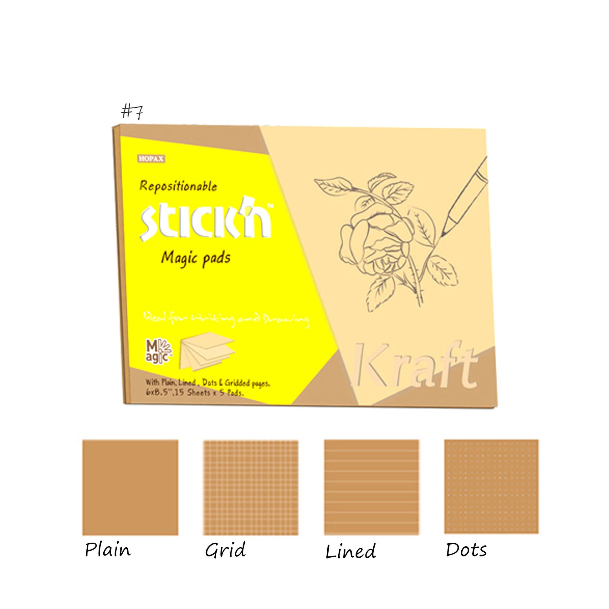 The #7 pad is a unique 'magic' 5 pads-in-one where you can open it up to your chosen type of writing surface of either plain sheet (15 pages), lined (15 pages), square grid (15 pages) dots (15 pages) and then another section of plain paper (15 pages).