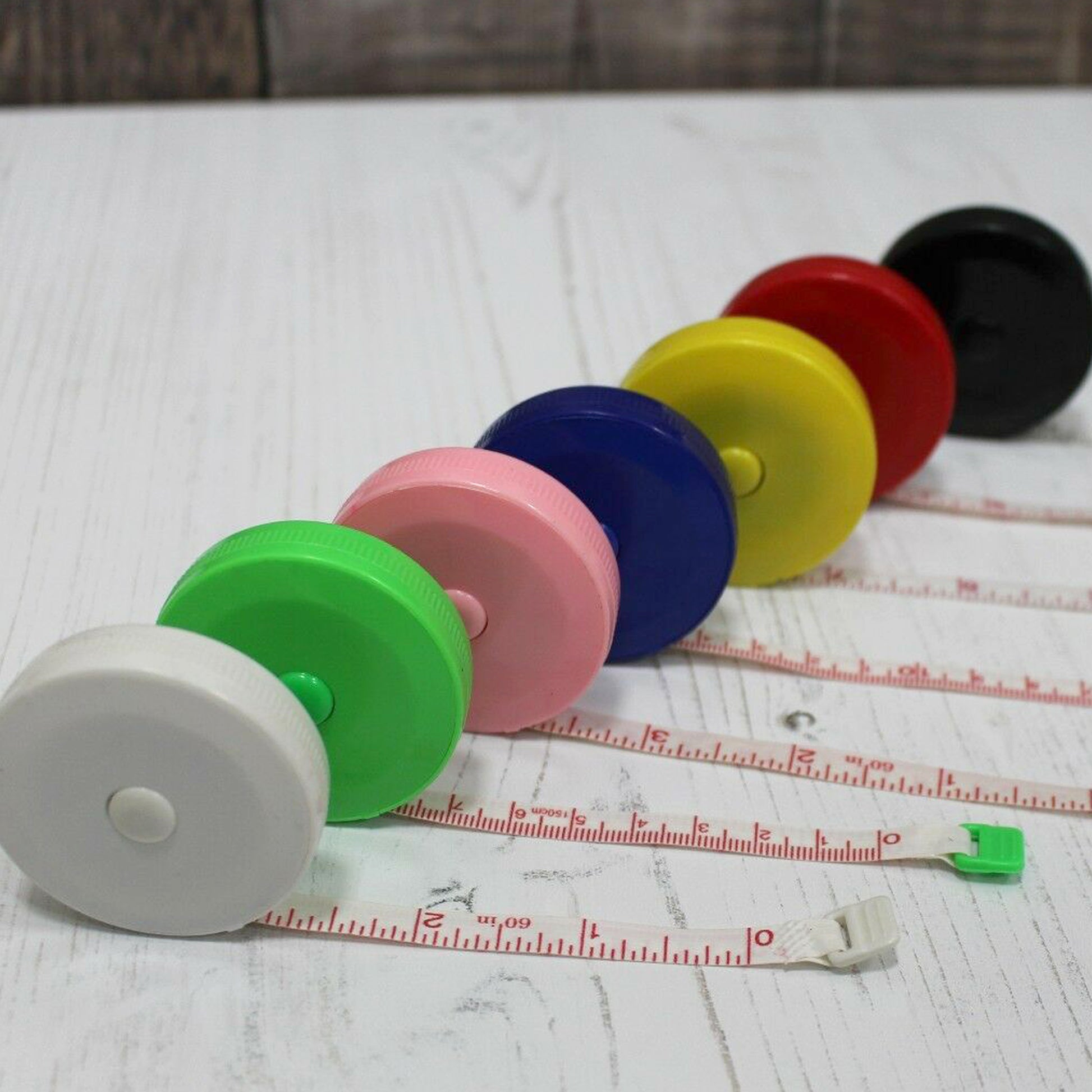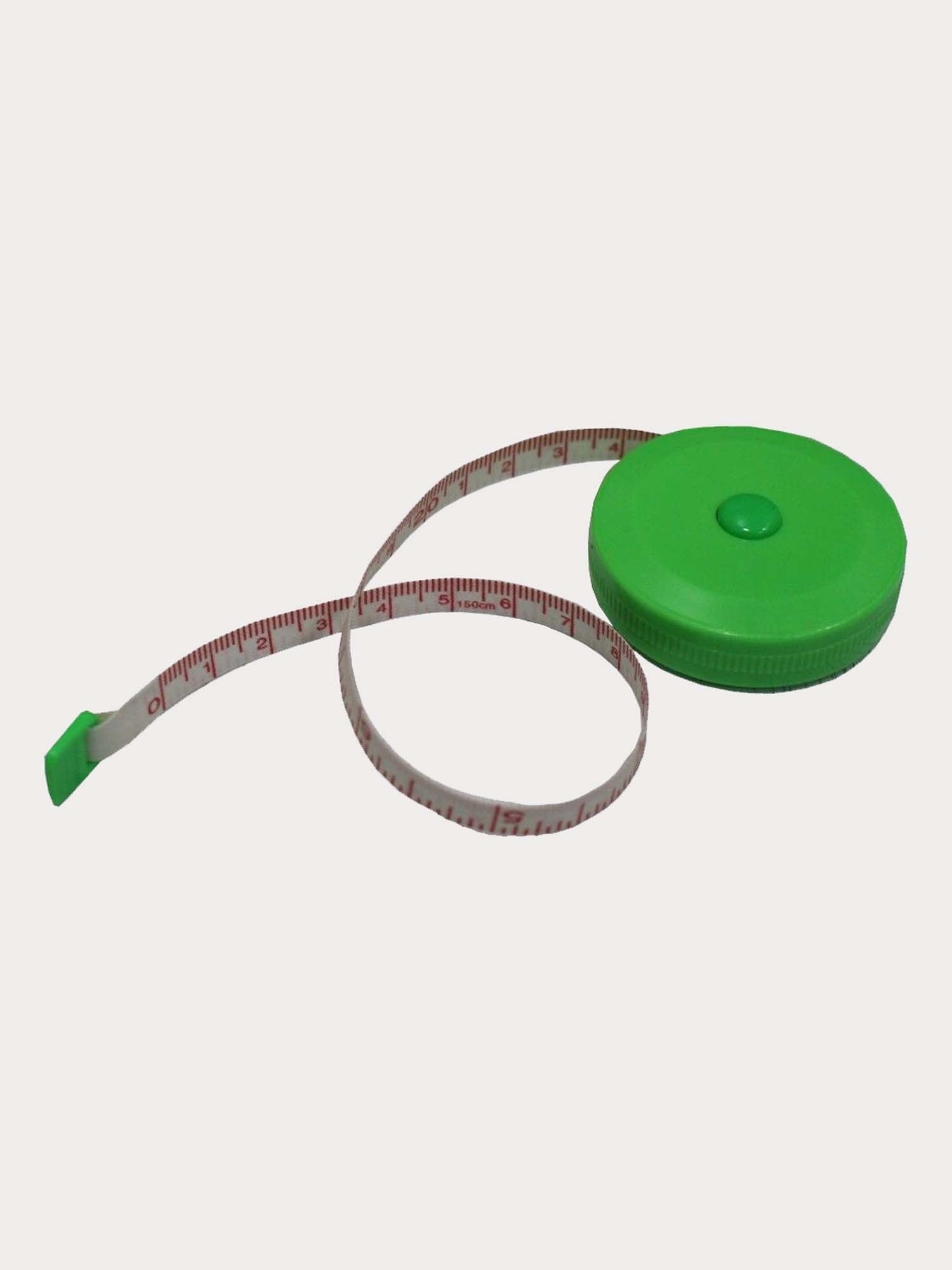 A round plastic retractable tape measure with a 150cm scale on one side and a 60 inch scale on the other side.