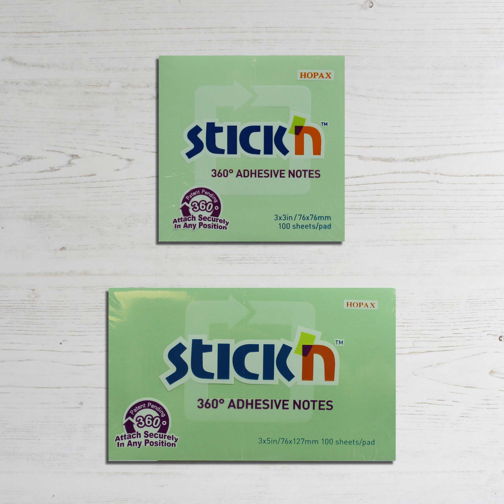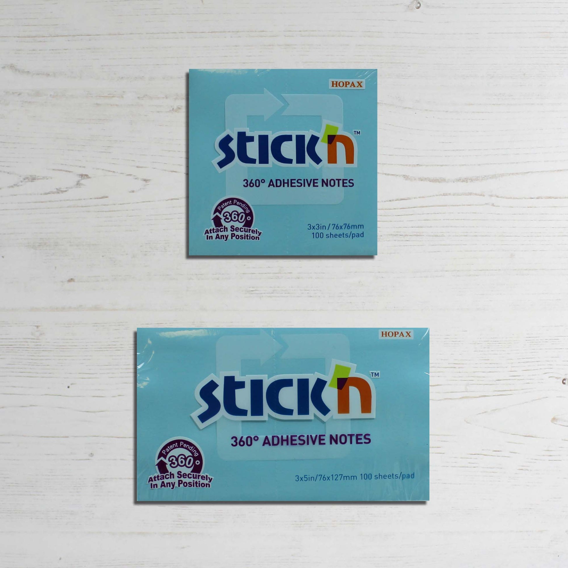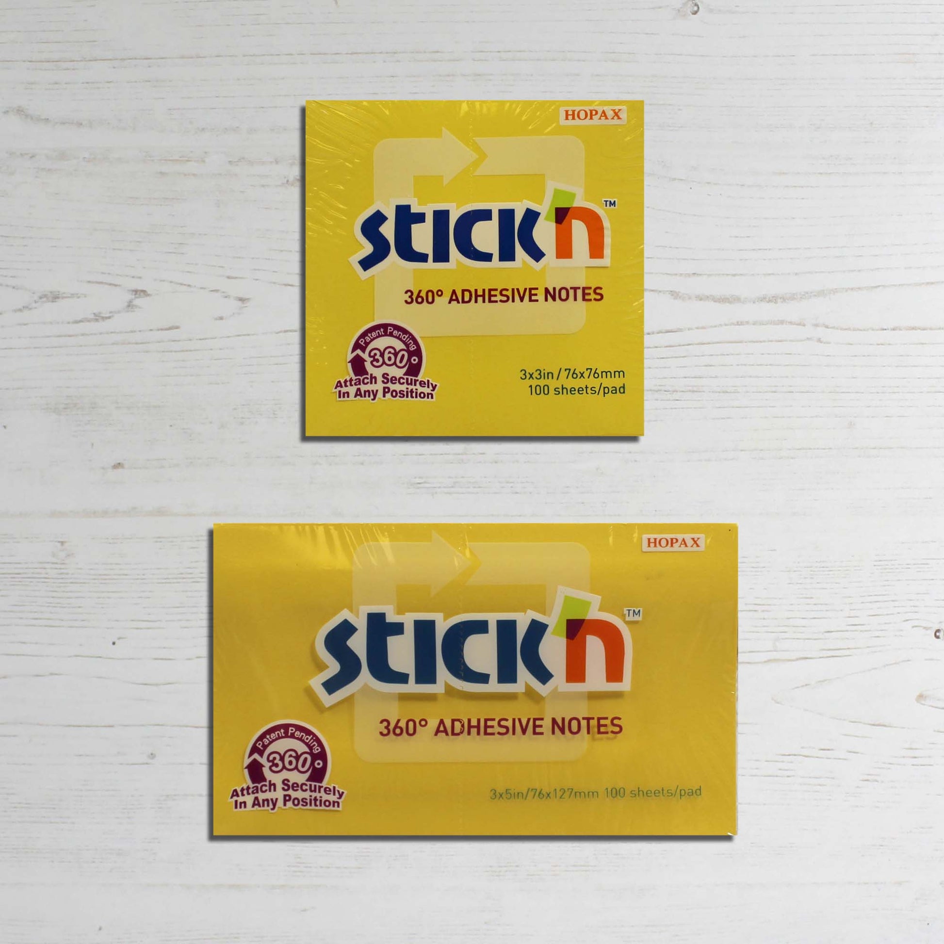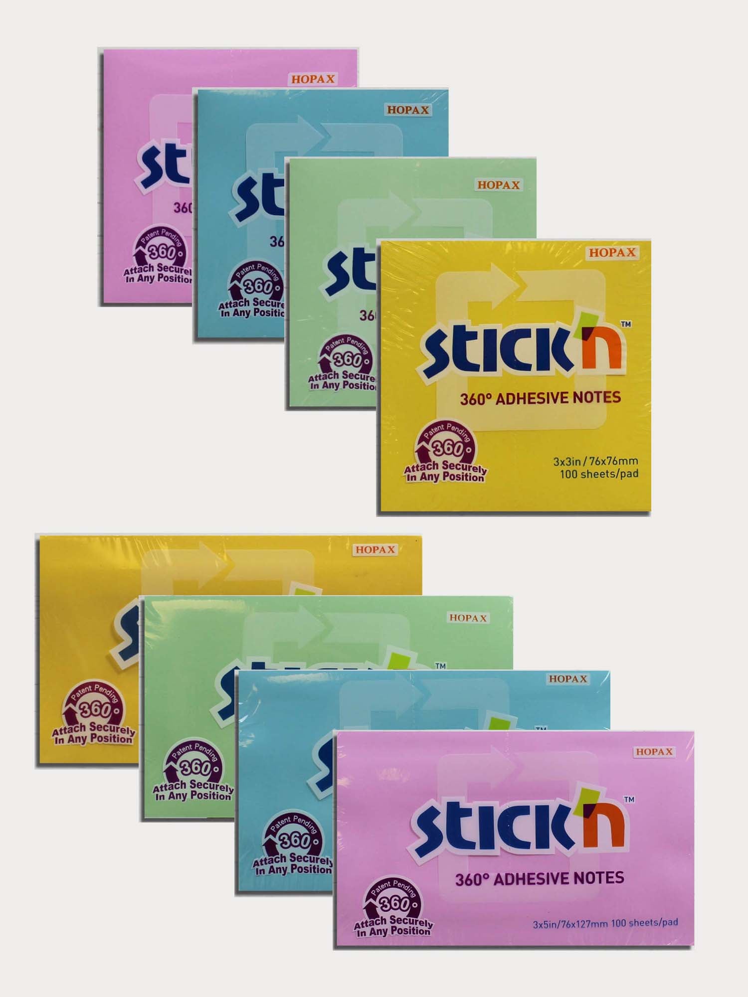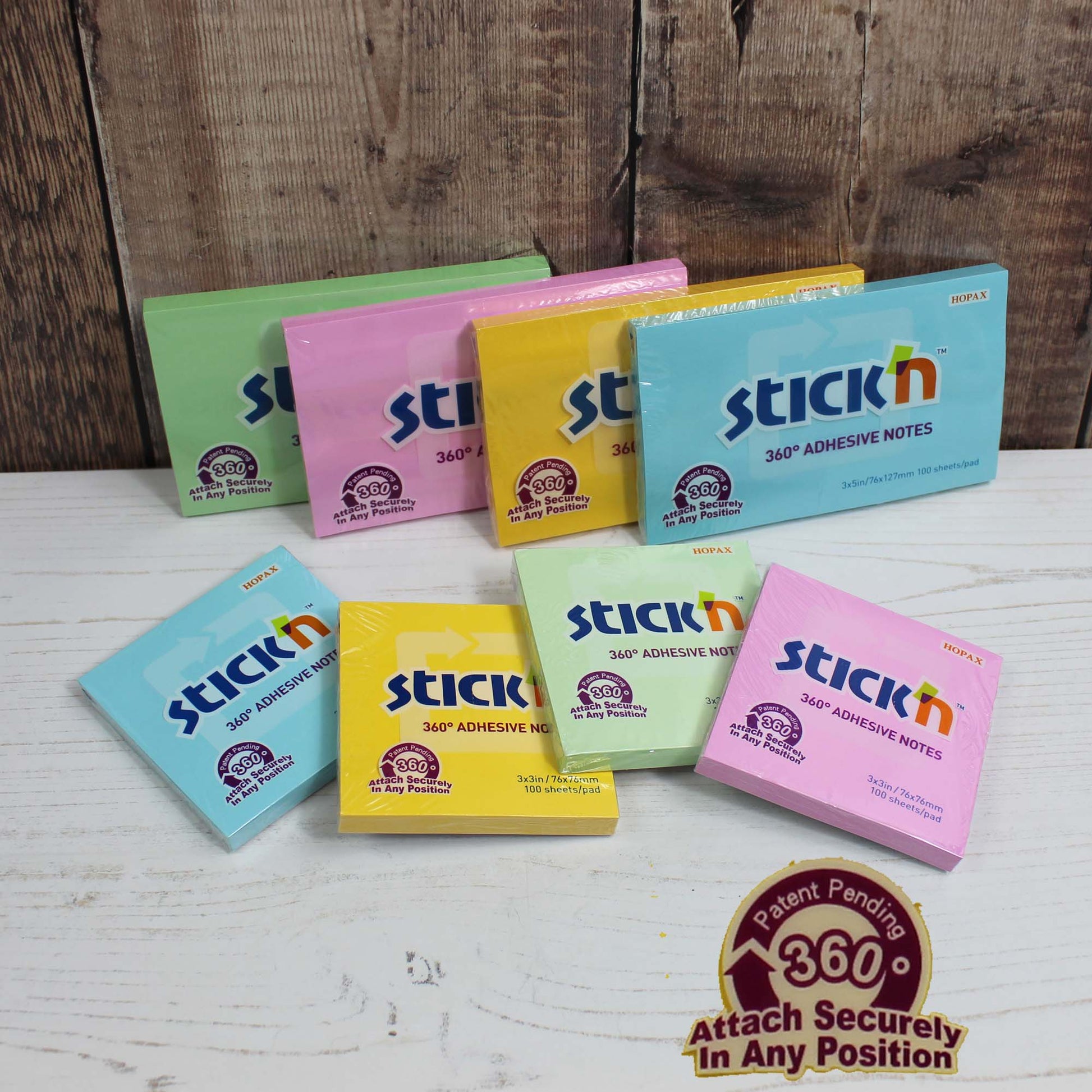 Stick'n sticky notes made by Hopax, one of the world's leading manufacturers of re-positional sticky notes using high quality smooth 80grm paper with all pads having 100 sheets per pad. The 360° shaped adhesive lets the note stick securely in any position, lying flat and holding firmly to more surfaces than ever.