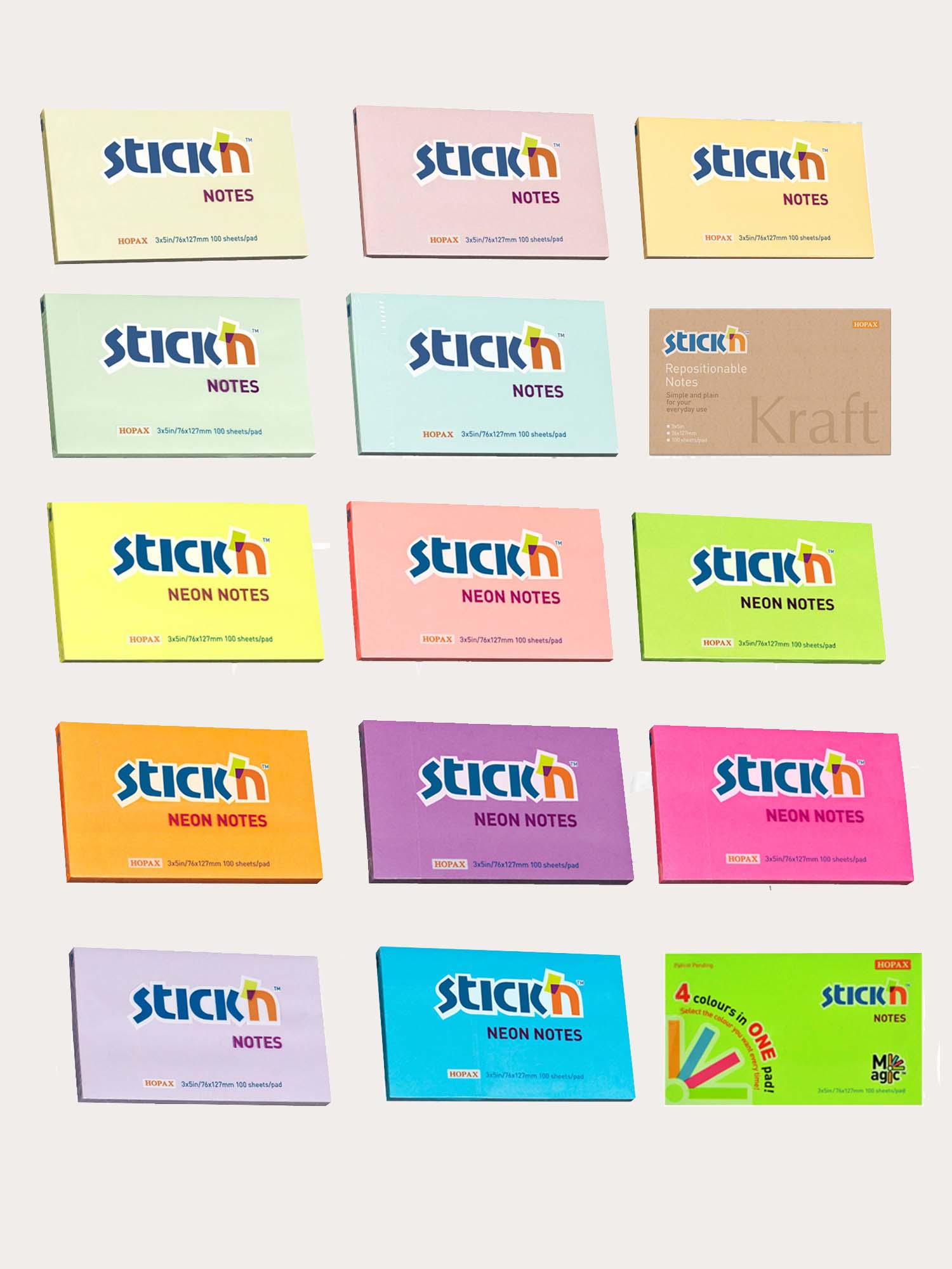 Stick'n sticky notes made by one of the world's leading manufacturers of repositionable sticky notes using high quality smooth 80grm paper with all pads having 100 sheets per pad.