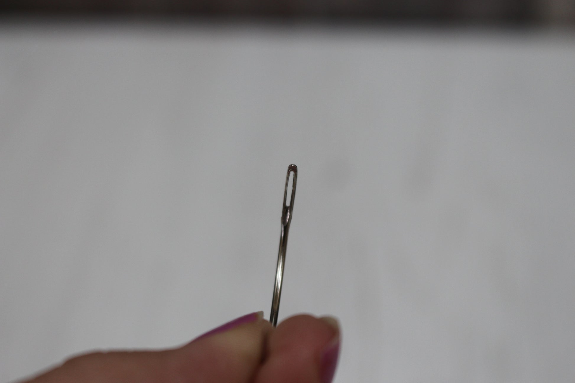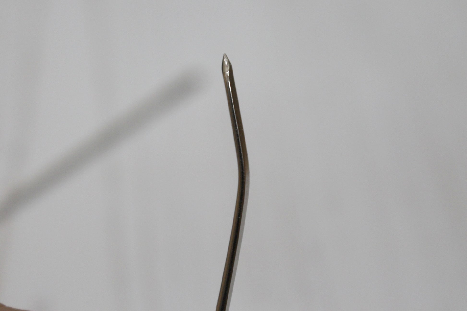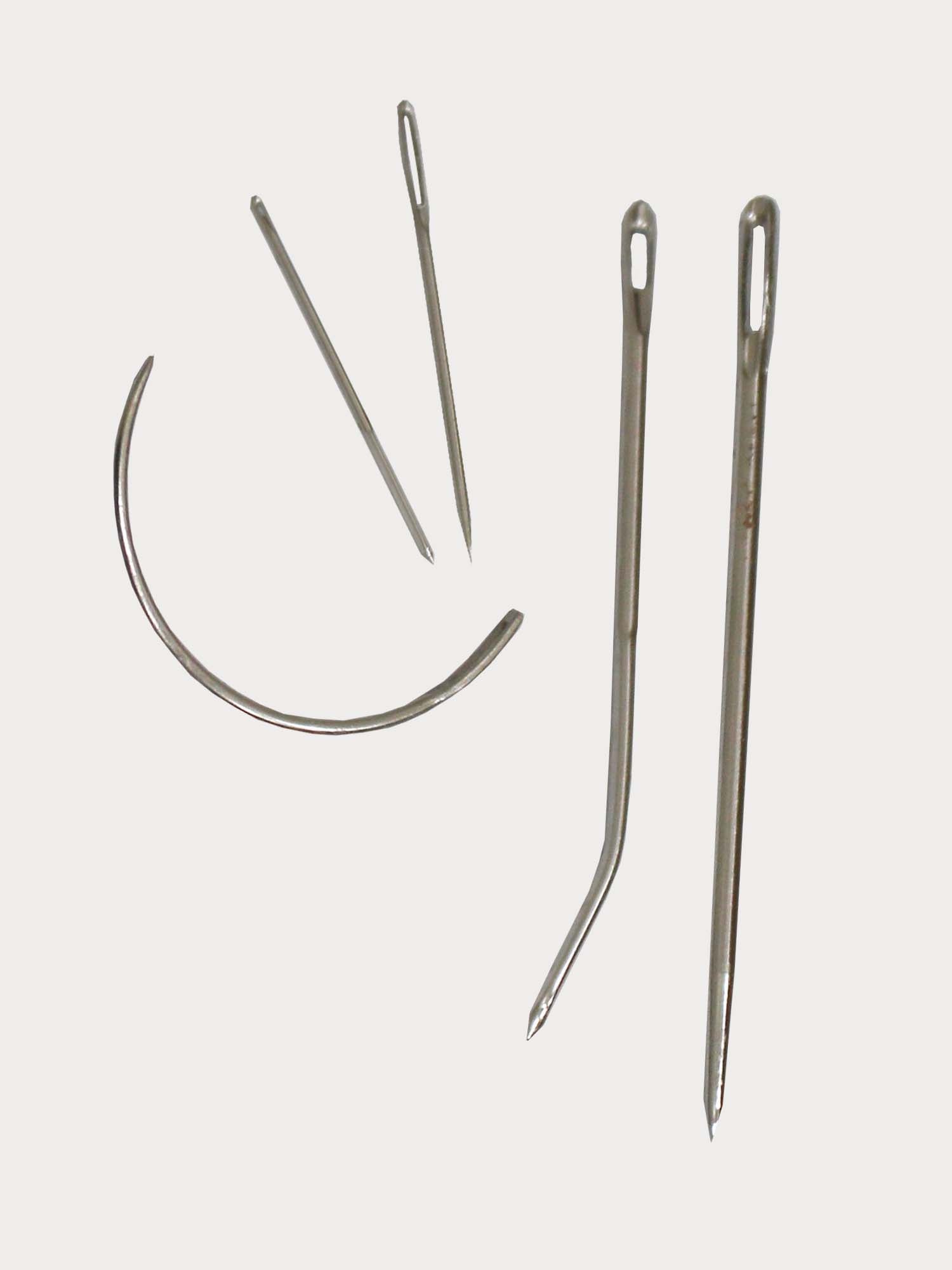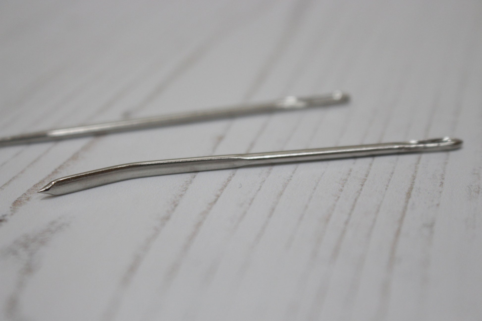 A strong and sturdy needle for sewing up packages or sacks. Has a long flat point at the end of the needle.