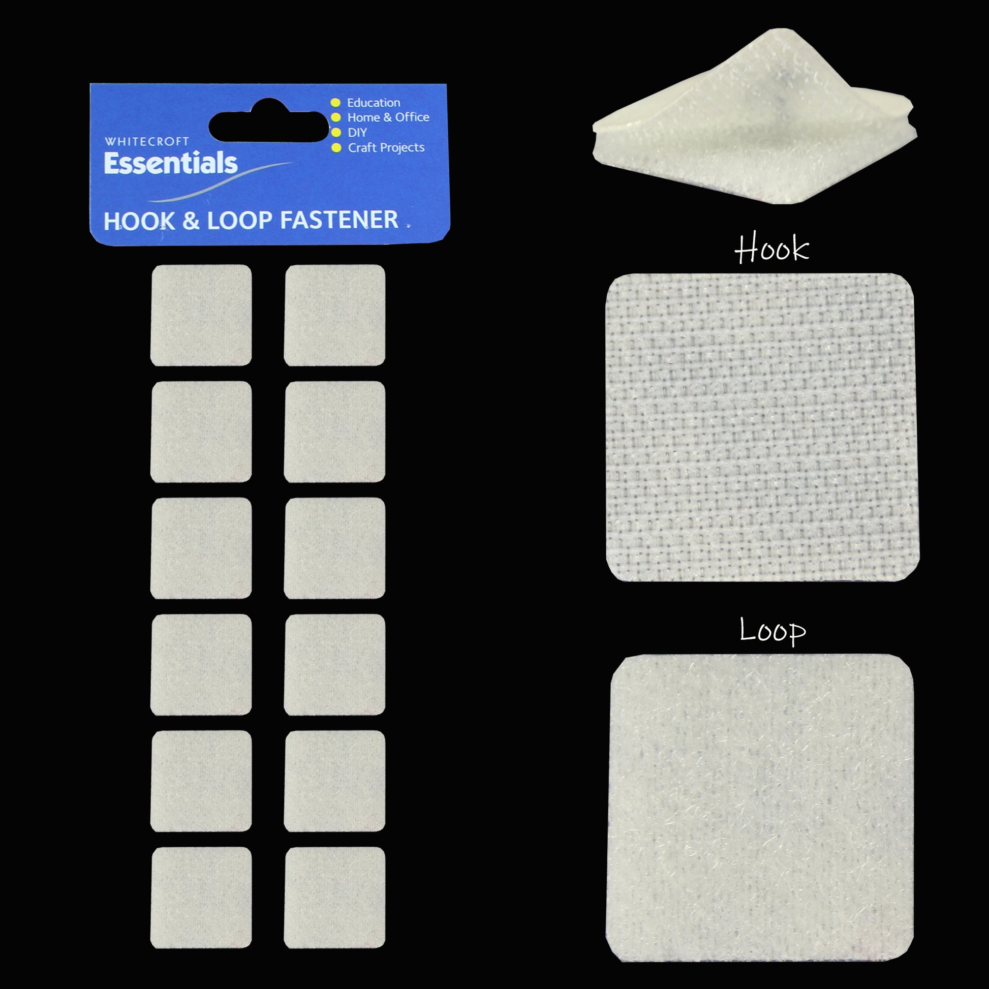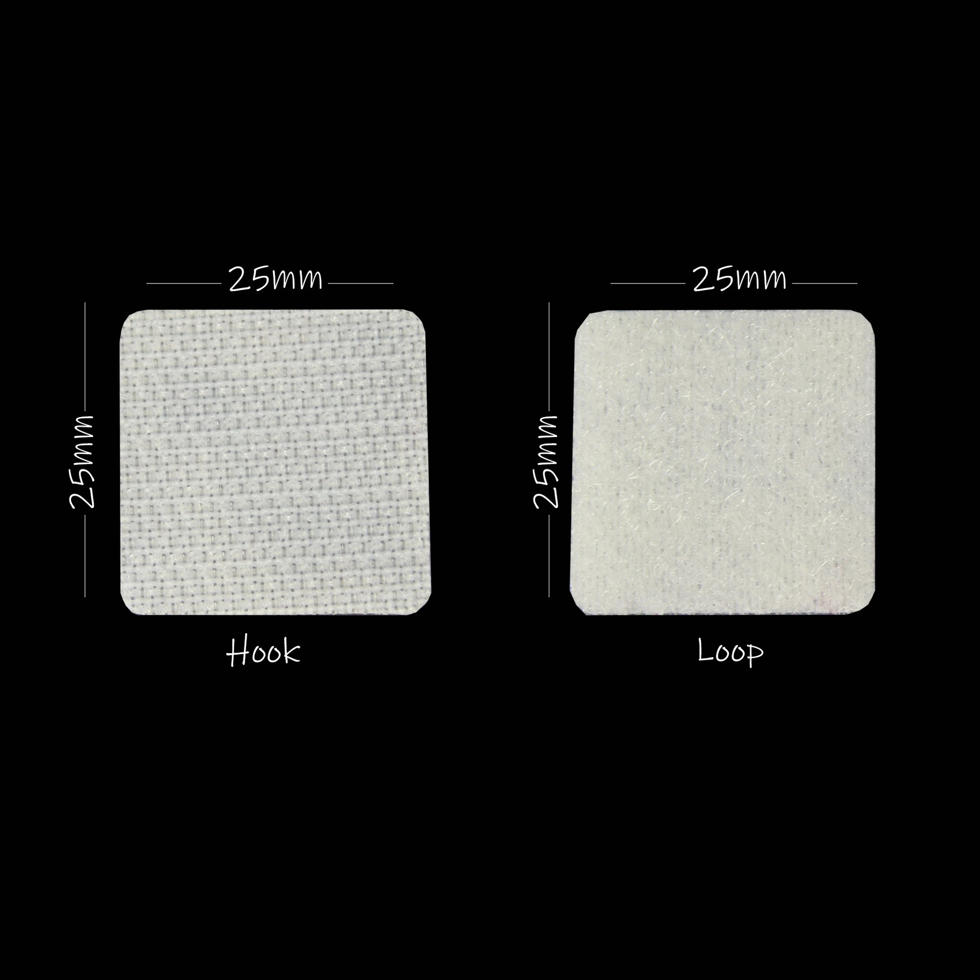 The Squares are 25mm x 25mm and available as 12 Sets (12 hook + 12 Loop) or 24 sets or 48 sets – chosen from the drop-down menu.