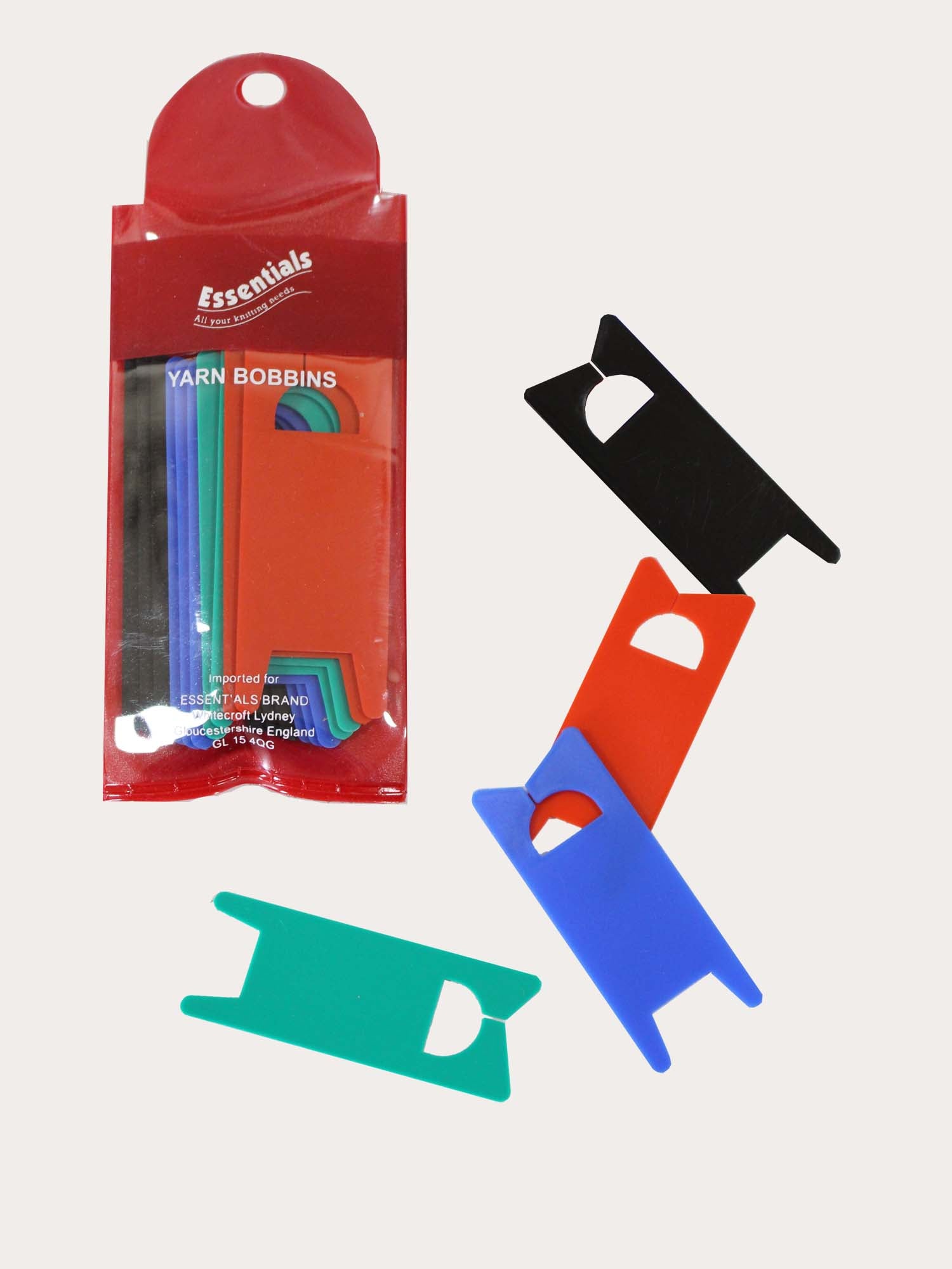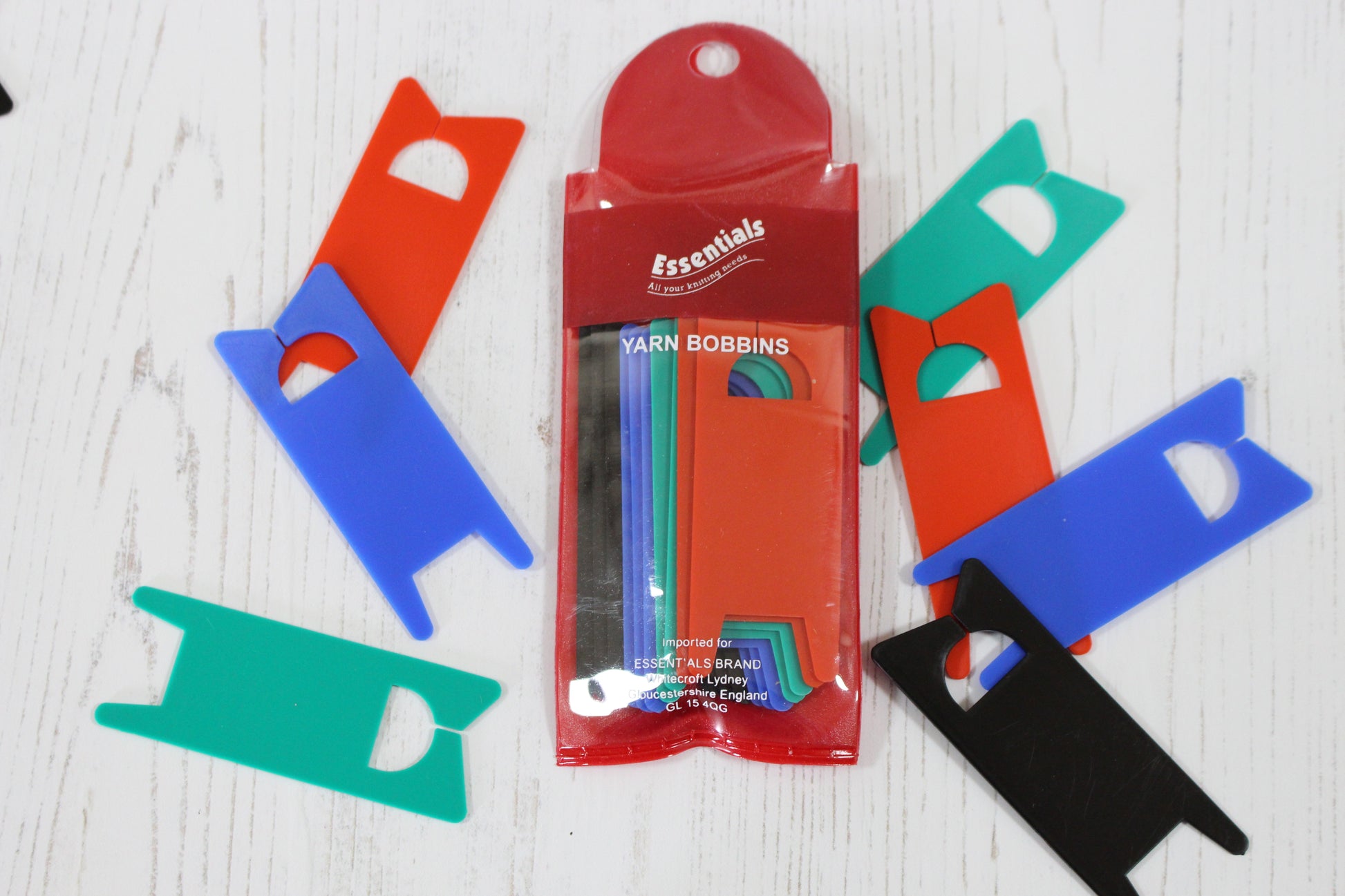 Whitecroft Essentials Branded Yarn Bobbins in assorted colours of red, blue, black and green.